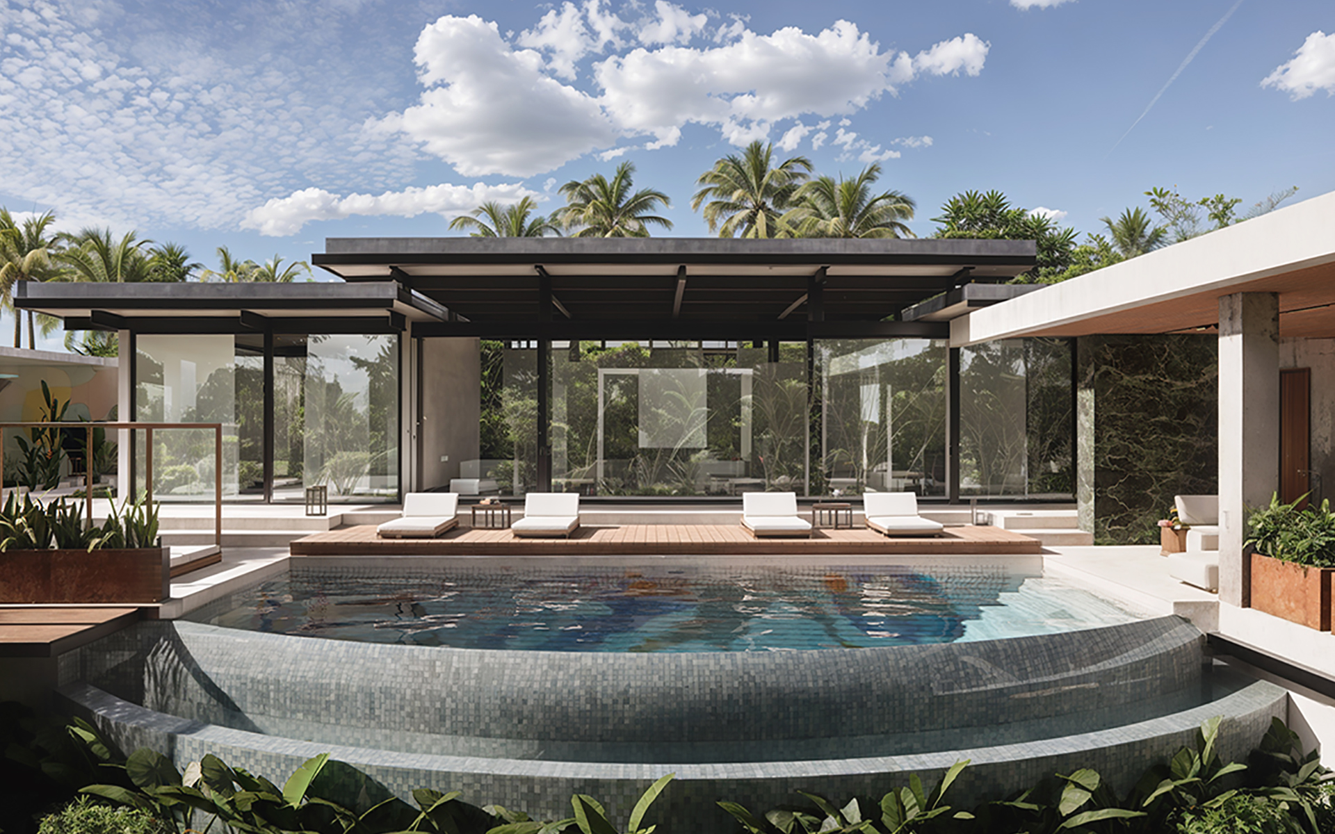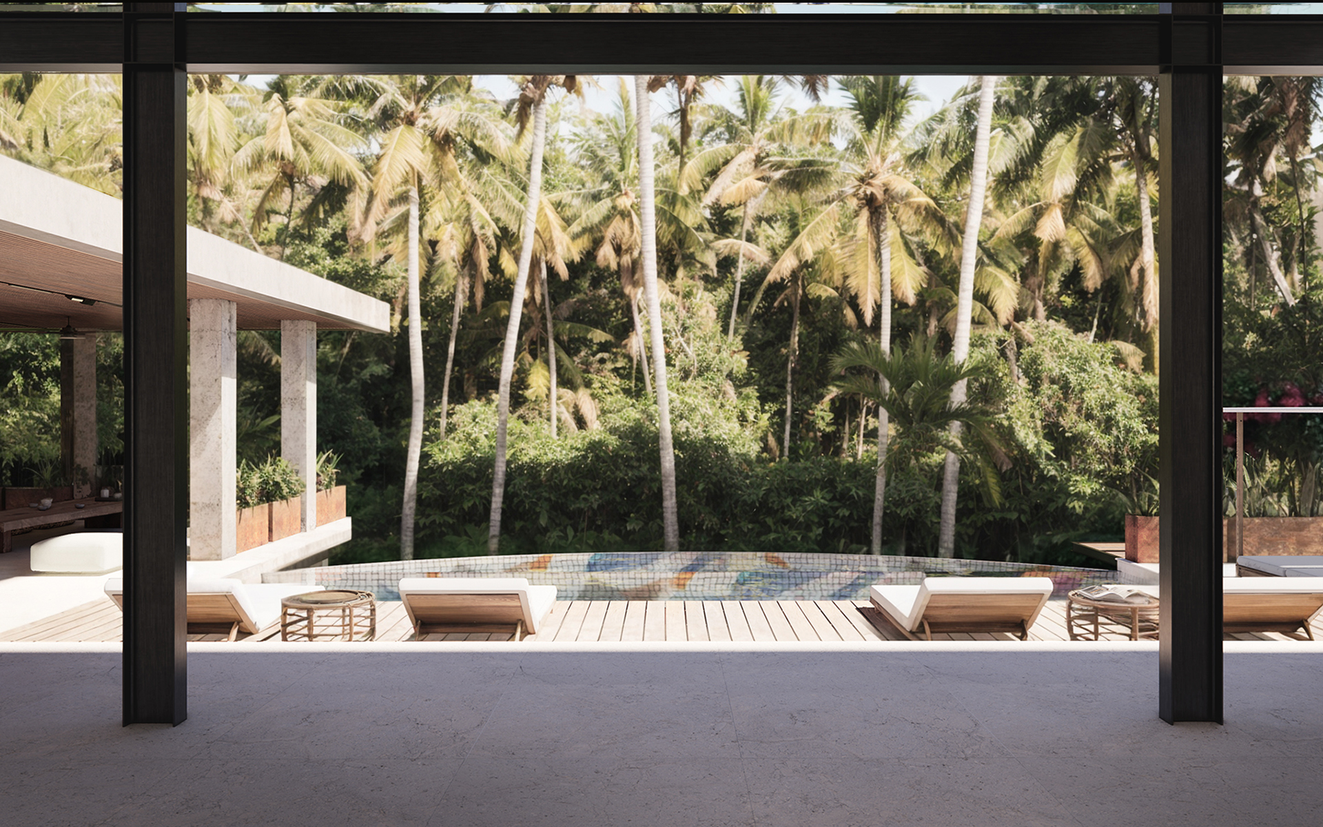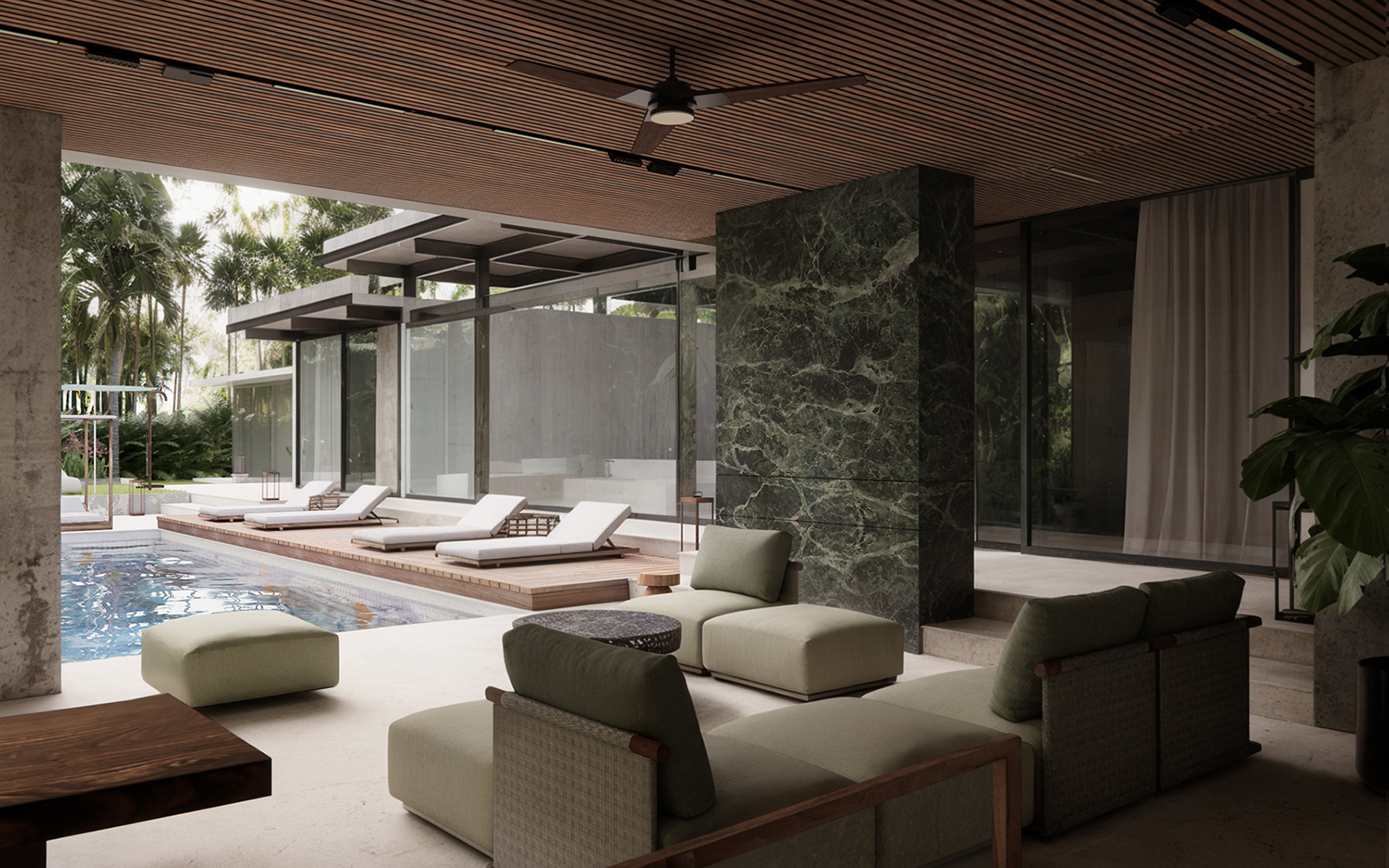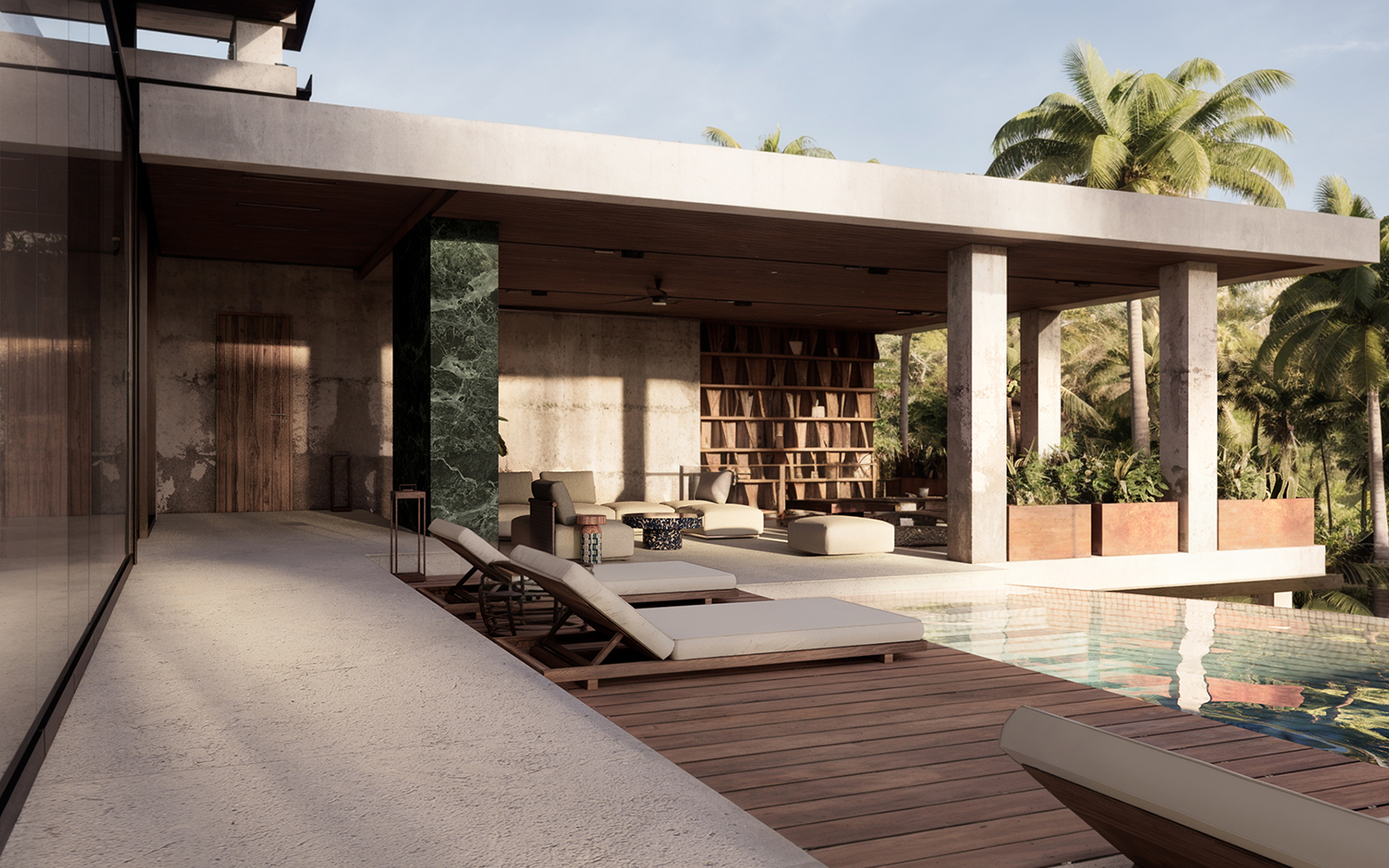 Проект направлен на создание гармоничной, функциональной и эстетически выразительной среды, в которой внутренние и внешние пространства органично перетекают друг в друга. Основная идея заключается в реорганизации пространства вокруг бассейна, делая его центральным элементом, связывающим интерьер и экстерьер. Акцент на природных элементах и мотивах подчёркивает связь виллы с окружающим ландшафтом. Нижний уровень будет преобразован в спа-зону со всеми необходимыми удобствами и удобными связями с верхним уровнем.