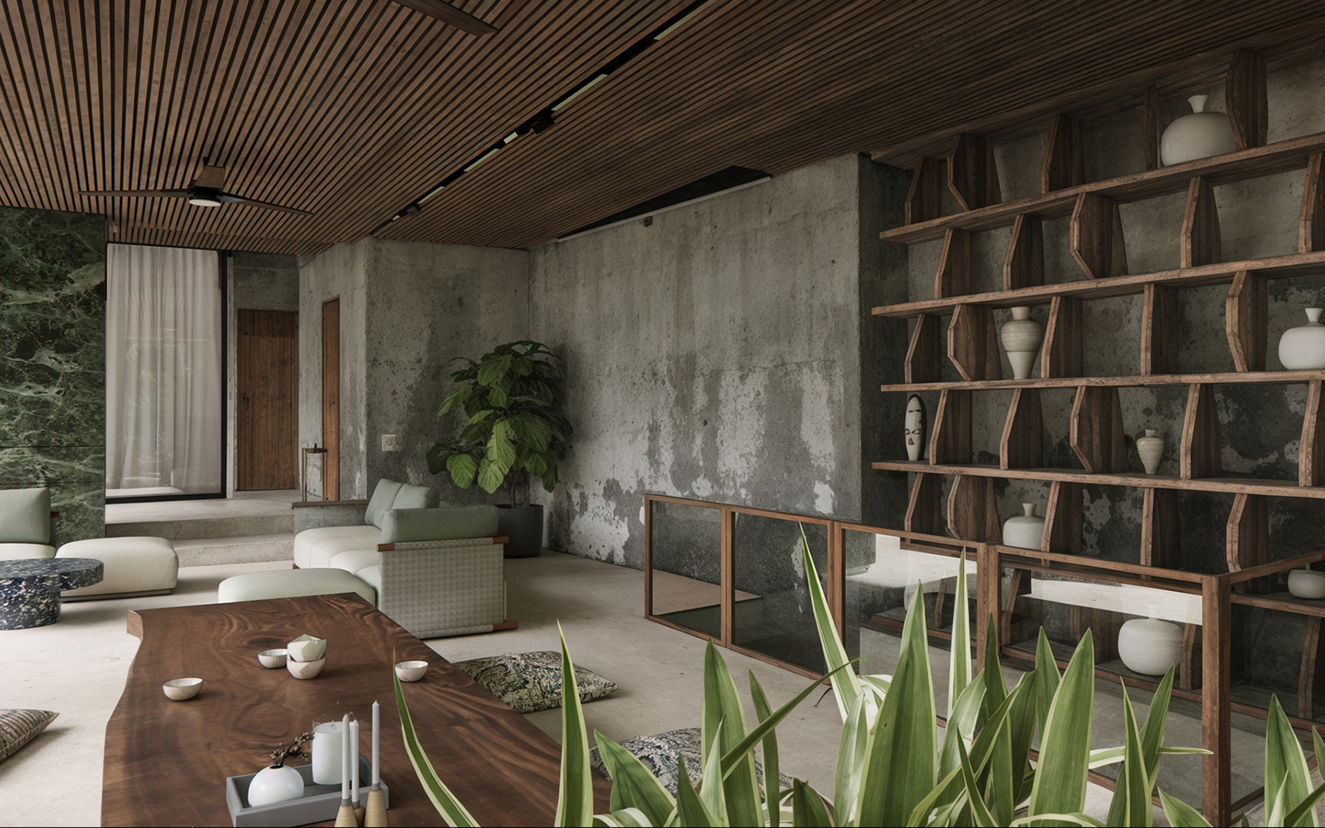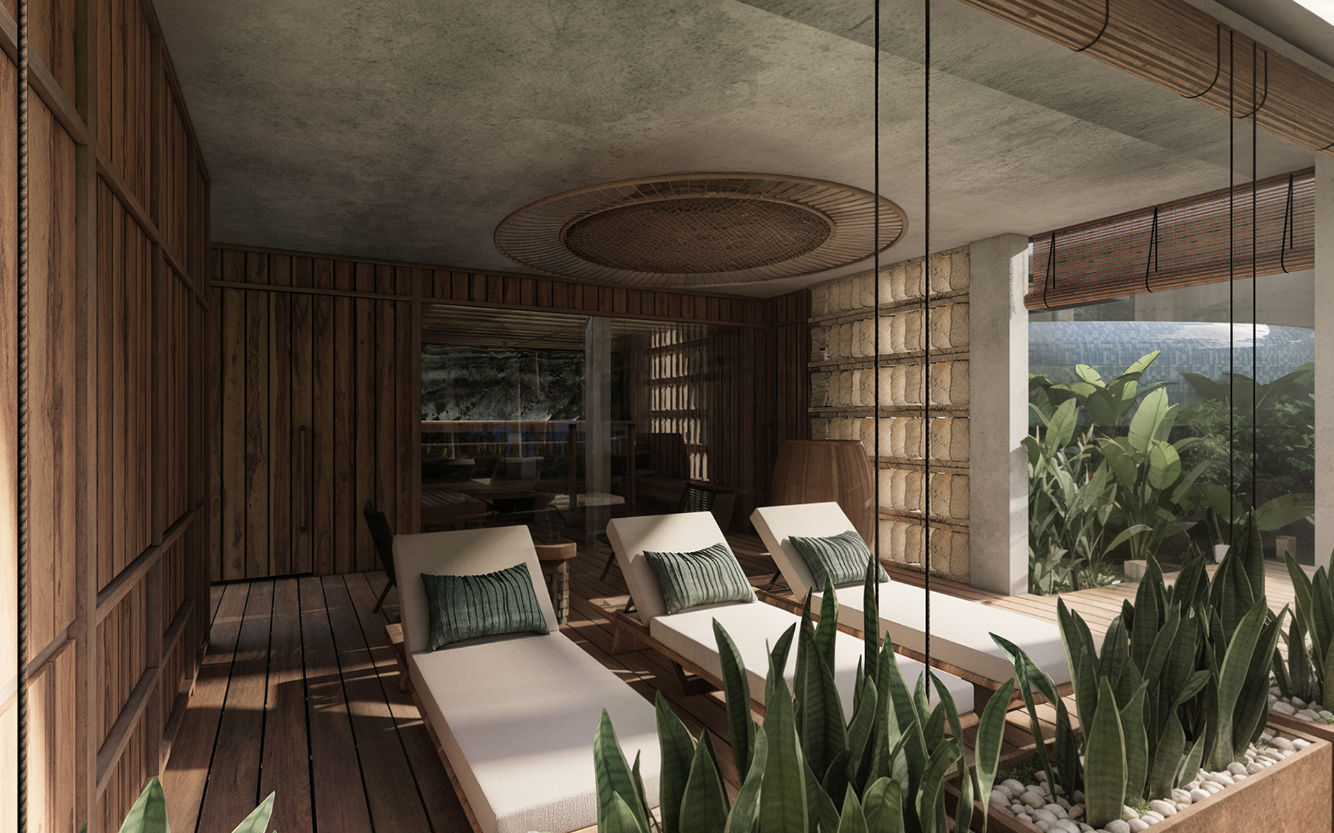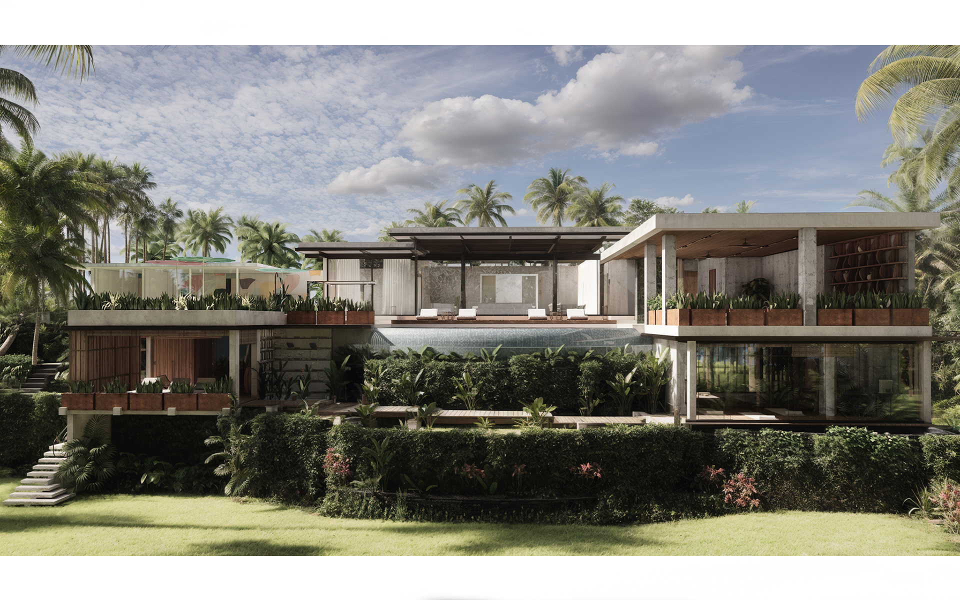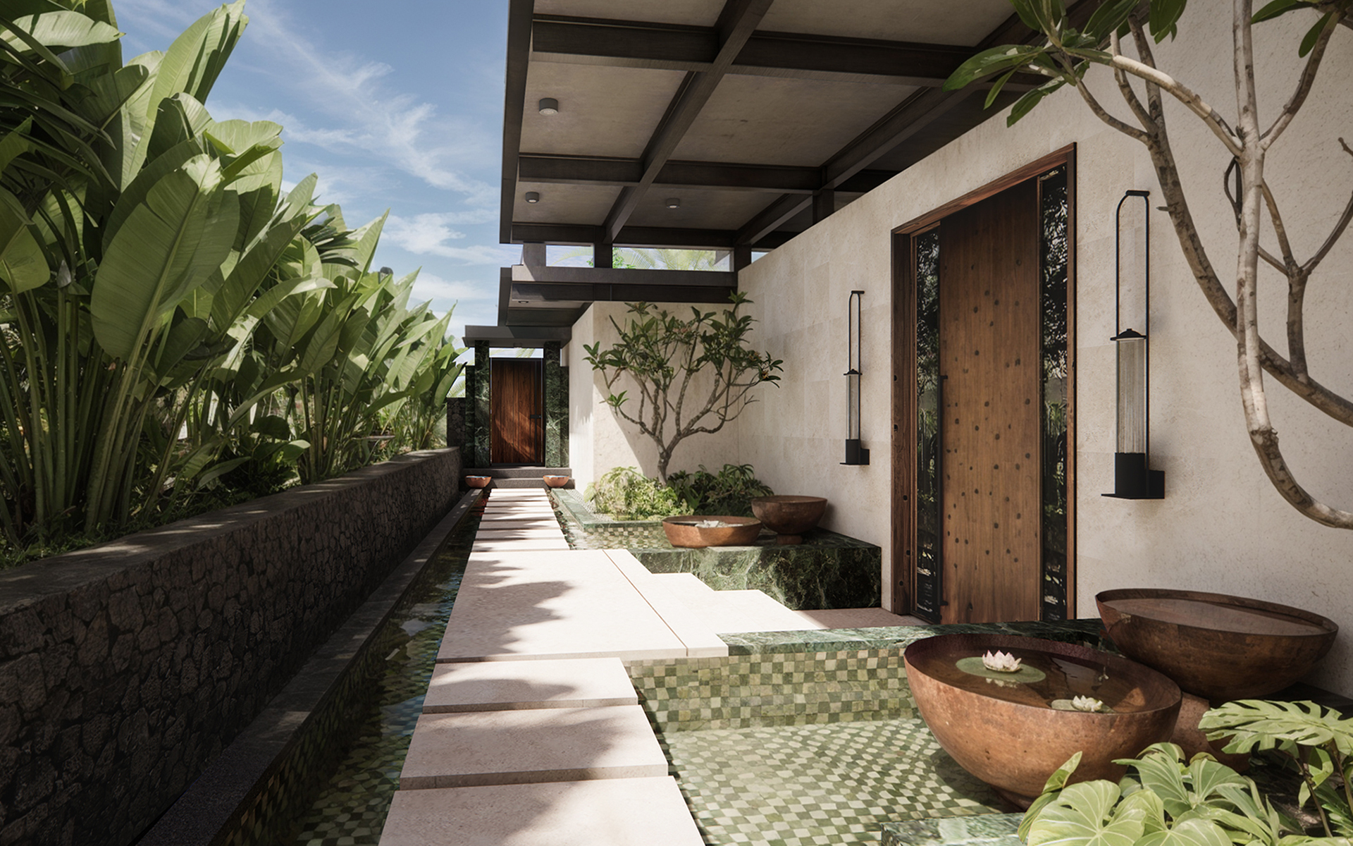 Проект направлен на создание гармоничной, функциональной и эстетически выразительной среды, в которой внутренние и внешние пространства органично перетекают друг в друга. Основная идея заключается в реорганизации пространства вокруг бассейна, делая его центральным элементом, связывающим интерьер и экстерьер. Акцент на природных элементах и мотивах подчёркивает связь виллы с окружающим ландшафтом. Нижний уровень будет преобразован в спа-зону со всеми необходимыми удобствами и удобными связями с верхним уровнем.